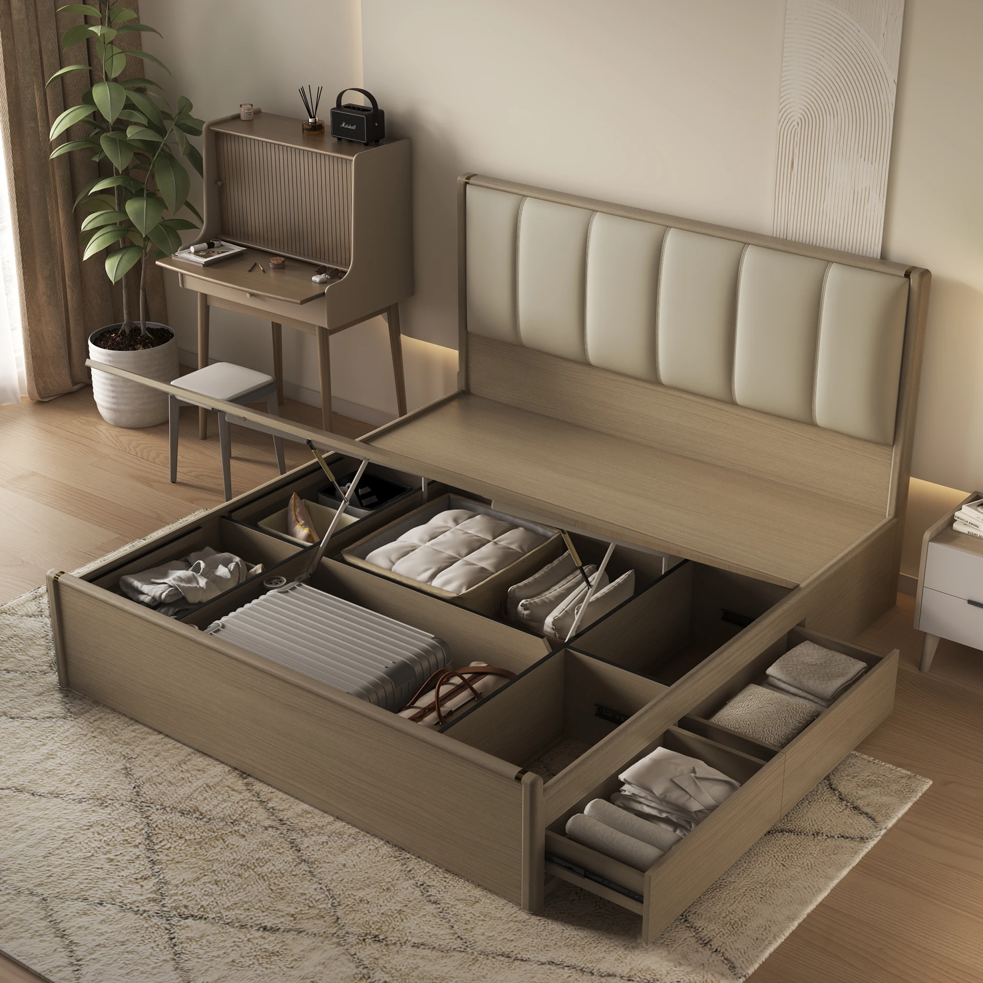 1.The Soft Headboard Cushion Upholstered Beds Genuinu Leather Queen Size Storage Bed with 3 Drawers Custom Floating Base Bedding Frame is a modern. up-holstered bed featuring a genuine leather upholstery in a stylish design.